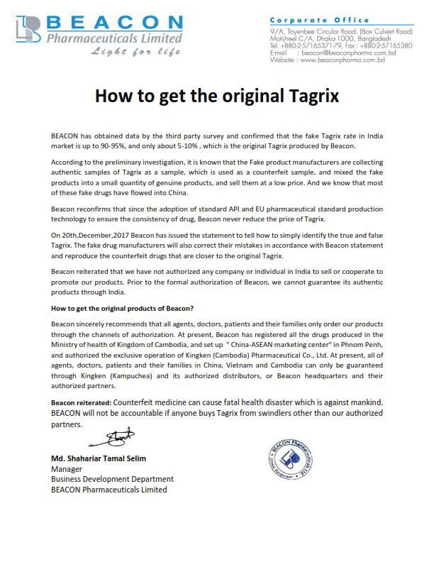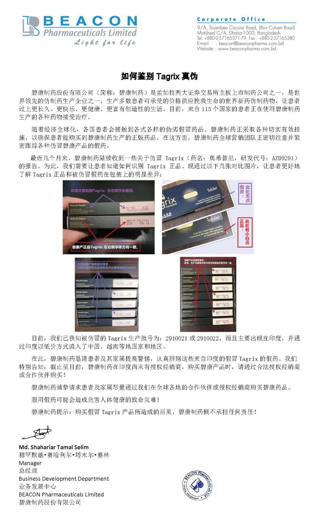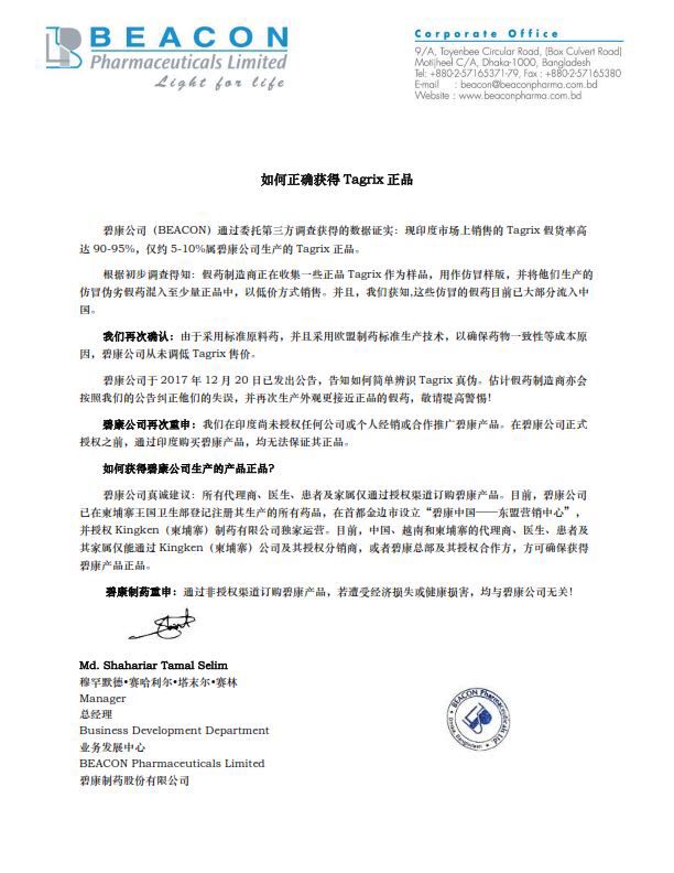 碧康公司于2017年12月20日已发出公告,告知如何简单辨识Tagrix真伪。估计假药制造商亦会按照我们的公告纠正他们的失误,并再次生产外观更接近正品的假药,敬请提高警惕!