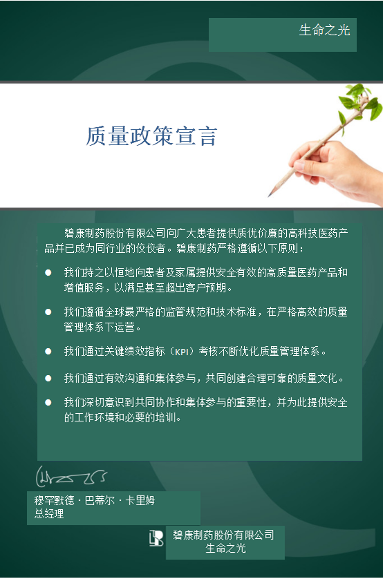 购买碧康制药产品,不必担心它的药品质量、安全性和药物有效性。碧康制药在政府职能部门的有效监管下,严格按照欧盟药典和美国药典等国际标准,建立并实施严格的产品质量管理体系,确保药品质量完全符合欧盟和美国药曲现行标准,并正在不断优化管理系统内的质量管控、生产管理、包装标签、物流配送、设备设施、科技研发和业务流程等诸多细节。