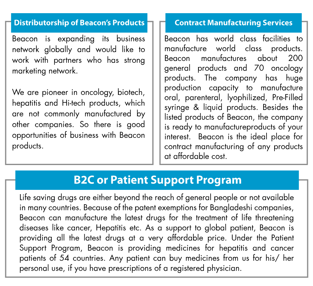Beacon Pharmaceuticals Limited has started its journey with a vision to become a global company. Beacon is the first company in Bangladesh to start export of life saving cancer drugs. The company is exporting its products in Asia, Africa and Latin America.